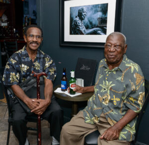 Cliff and Coffee enjoying a beer in front of a 2016 photo of Coffee immortalized at the Little Room Jazz Club – Jazz Wall of Fame.